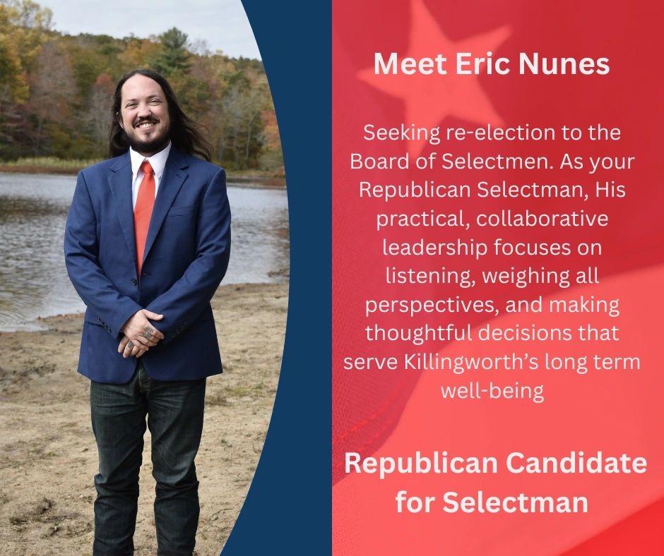 I am honored to be a candidate for re-election as Selectman here in Killingworth. Over the past two years, I have served as your Republican Selectman, working with residents and colleagues to strengthen our community while keeping fiscal responsibility at the forefront.